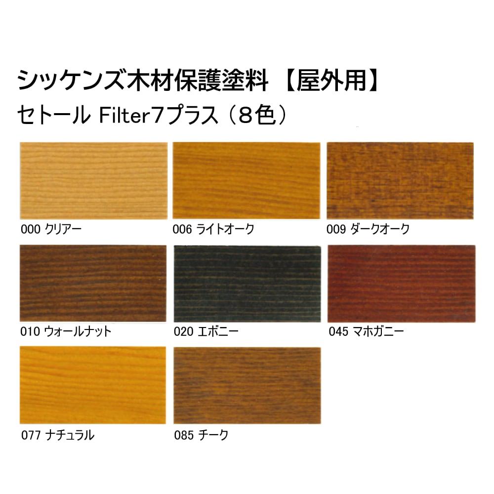 「セトールフィルターセブンプラス」は、厚めの塗膜を形成し抜群の耐久性を誇る塗料です。木目を活かした半透明の仕上がりで、高級感のあるツヤ(中間光沢)が特徴です。